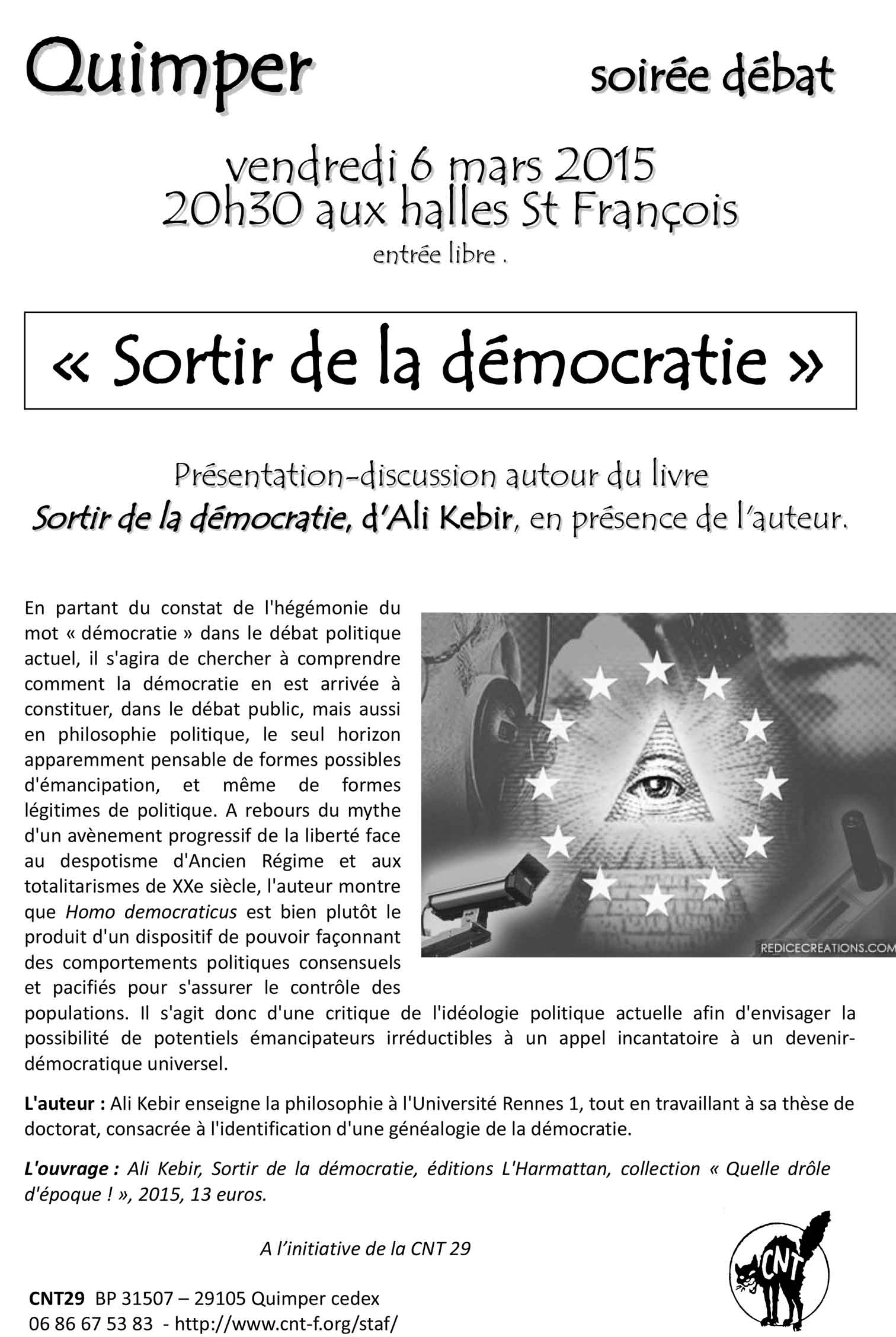 L’ouvrage : Ali Kebir, Sortir de la démocratie, éditions L’Harmattan, collection « Quelle drôle d’époque ! », 2015, 13 euros.