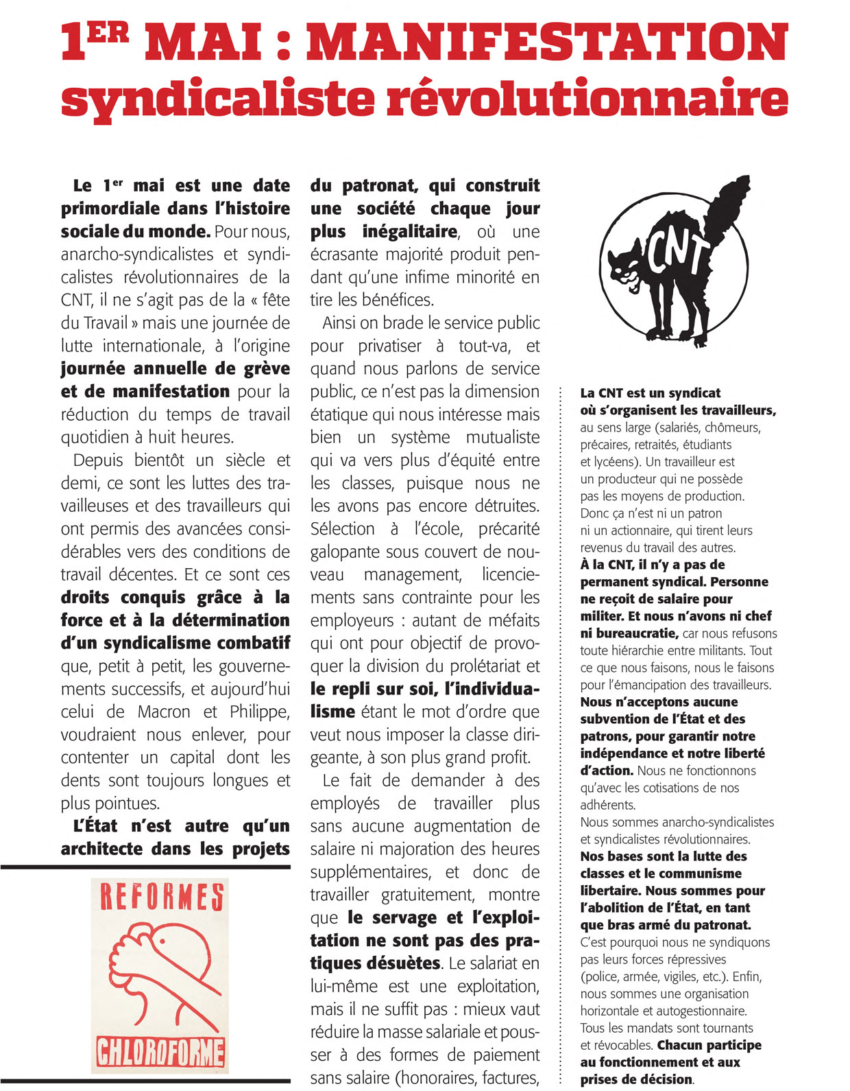 Le 1er mai est une date primordiale dans l’histoire sociale du monde, pour la CNT il ne s’agit pas de la « fête du travail » mais d’une journée de lutte. Dans le contexte actuel, il apparaît plus que jamais nécessaire à la CNT que les travailleurs se rassemblent. A l’heure du choix entre victimes ou acteurs de nos vies, c’est dans la lutte et l’auto-organisation qu’ils se libéreront du capital et de ses représentants.