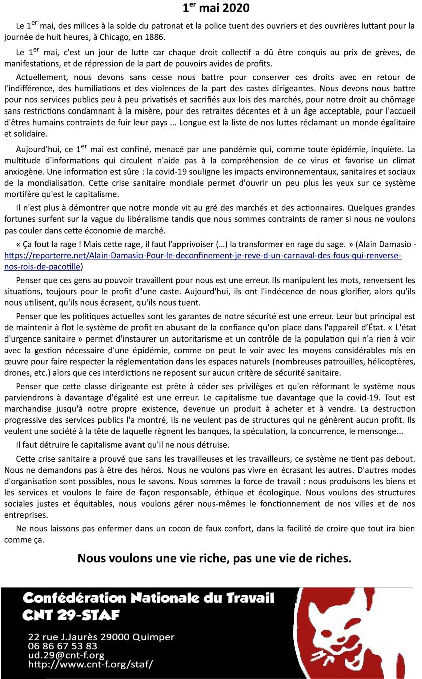 Aujourd’hui, ce 1er mai est confiné, menacé par une pandémie qui, comme toute épidémie, inquiète. La multitude d’informations qui circulent n’aide pas à la compréhension de ce virus et favorise un climat anxiogène. Une information est sûre : la covid-19 souligne les impacts environnementaux, sanitaires et sociaux de la mondialisation. Cette crise sanitaire mondiale permet d’ouvrir un peu plus les yeux sur ce système mortifère qu’est le capitalisme.
