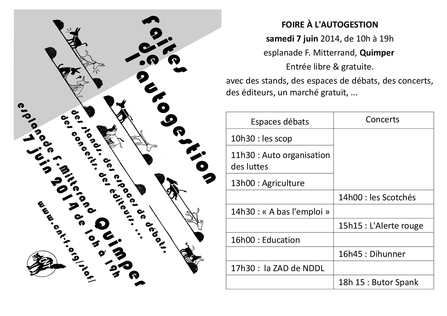 La foire à l’autogestion de Quimper se veut le point de rencontres, d’échanges, de communications, de stimulation de toutes les expériences d’autogestion.
