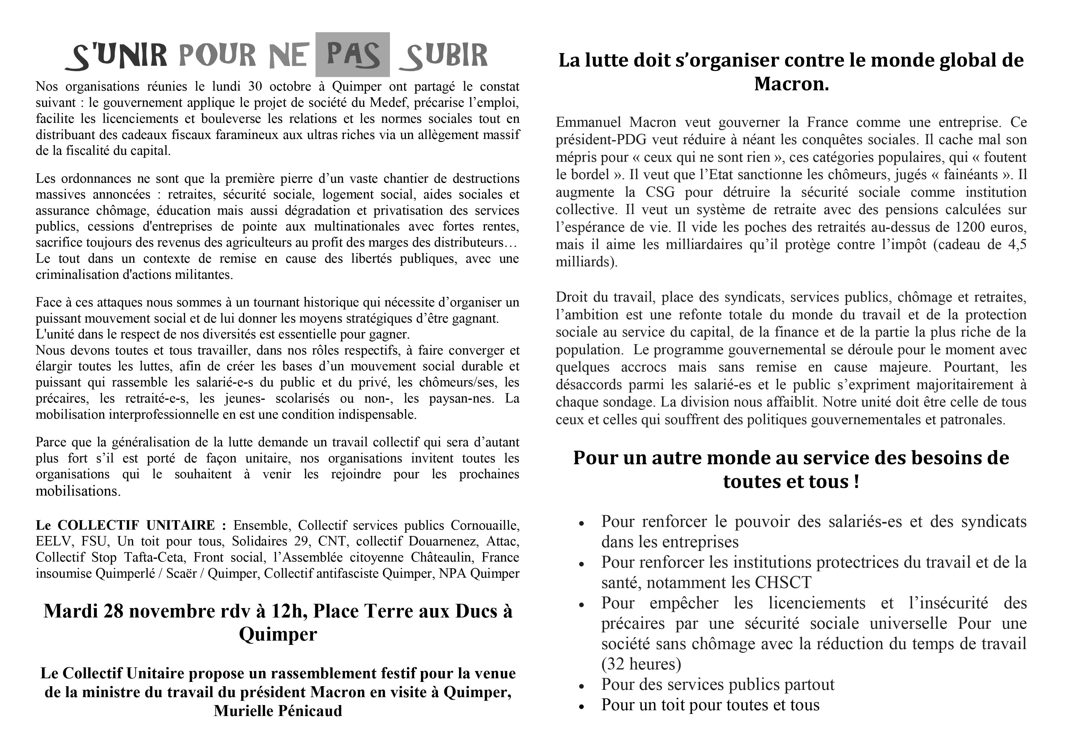 Le Collectif Unitaire propose un rassemblement à l’occasion de la venue de Murielle Pénicaud, ministre du travail, en visite à Quimper