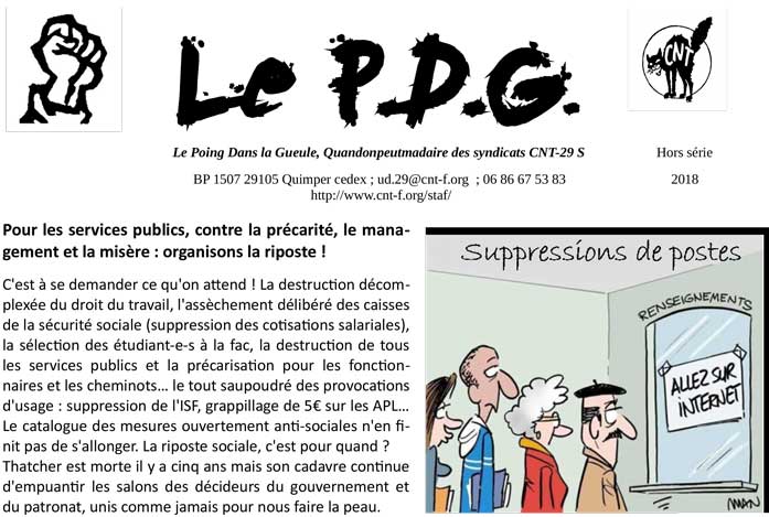 C’est à se demander ce qu’on attend ! La destruction décomplexée du droit du travail, l’assèchement délibéré des caisses de la sécurité sociale (suppression des cotisations salariales), la sélection des étudiant-e-s à la fac, la destruction de tous les services publics et la précarisation pour les fonctionnaires et les cheminots… le tout saupoudré des provocations d’usage : suppression de l’ISF, grappillage de 5€ sur les APL… Le catalogue des mesures ouvertement anti-sociales n’en finit pas de s’allonger. La riposte sociale, c’est pour quand ?
