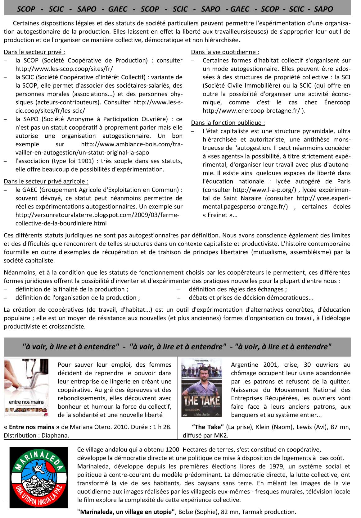 « à voir, à lire et à entendre » : « Entre nos mains » – “The Take” (La prise)- « Marinaleda, un village en utopie »
