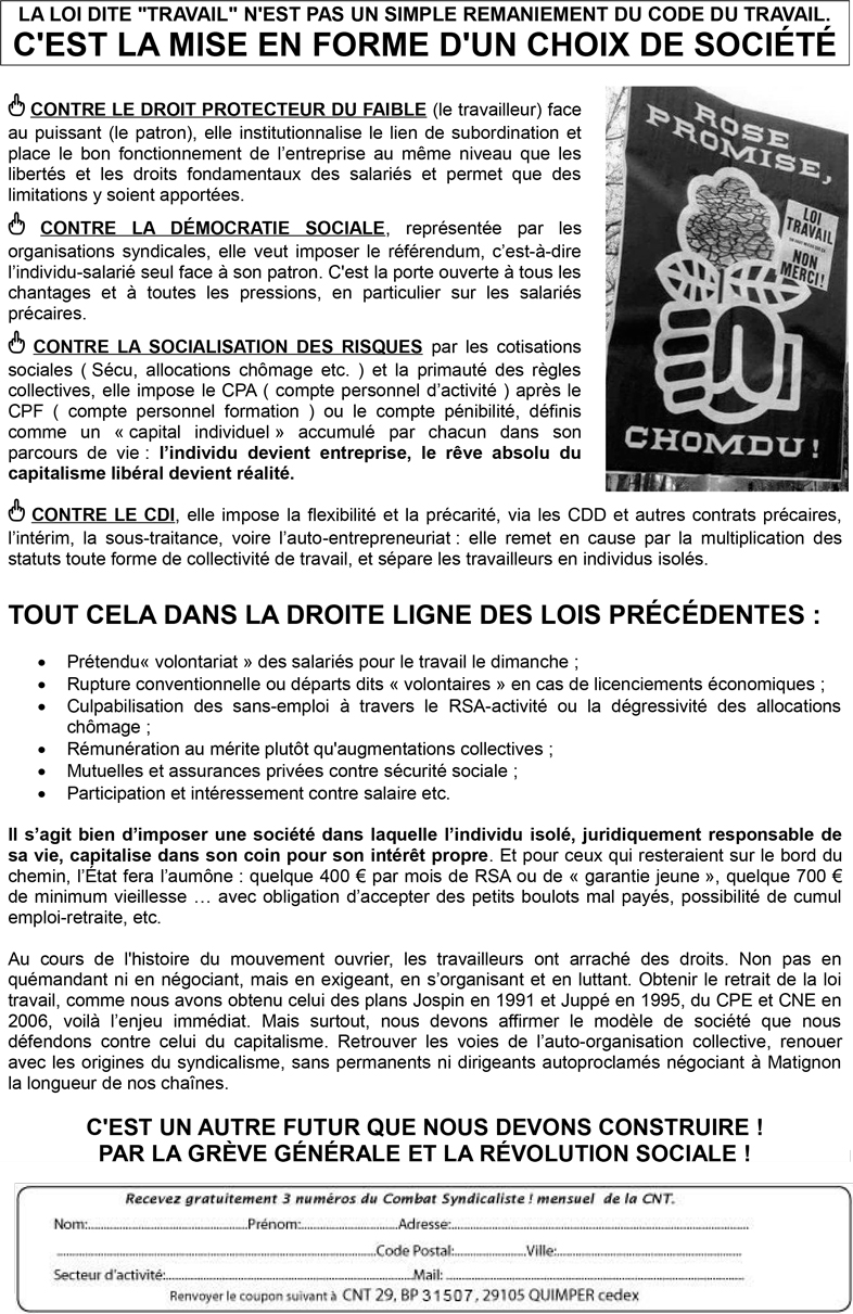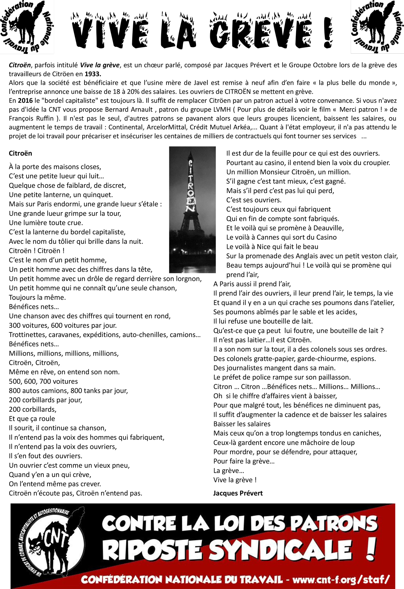 En 2016 le « bordel capitaliste » est toujours là. Il suffit de remplacer Citröen par un patron actuel à votre convenance. Si vous n’avez pas d’idée la CNT vous propose Bernard Arnault , patron du groupe LVMH ( Pour plus de détails voir le film « Merci patron ! » de François Ruffin ). Il n’est pas le seul, d’autres patrons se pavanent alors que leurs groupes licencient, baissent les salaires, ou augmentent le temps de travail : Continental, ArcelorMittal, Crédit Mutuel Arkéa,… Quant à l’état employeur, il n’a pas attendu le projet de loi travail pour précariser et insécuriser les centaines de milliers de contractuels qui font tourner ses services …